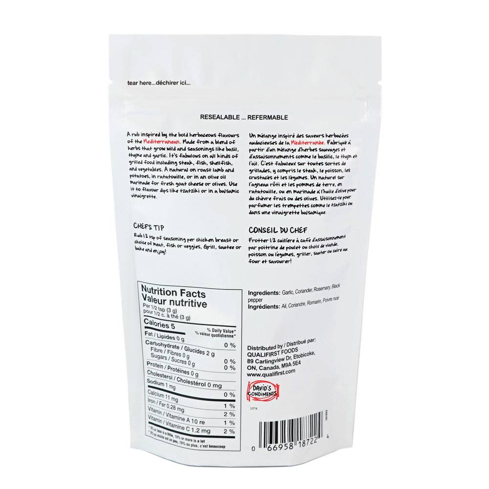 A rub inspired by the bold herbaceous flavors of the Mediterranean. Made from a blend of herbs that grow wild and seasonings like basil, thyme, and garlic. It's fabulous on all kinds of grilled food including steak, fish, shellfish, and vegetables. A natural on roast lamb and potatoes, in ratatouille, or in an olive oil marinade for fresh goat cheese or olives. Use it to flavor dips like tzatziki or in a balsamic vinaigrette.