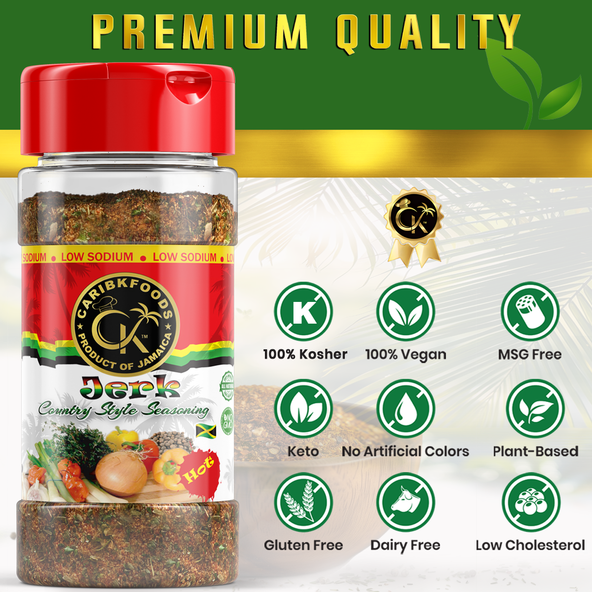Our expertly crafted Caribbean Kitchen Kosher Hot Jerk Seasoning brings a flavorful kick to any dish. Made with all natural ingredients and without GMOs or gluten, it's also perfect for those seeking a low sodium and vegan friendly option. Elevate your meals with this spicy and versatile seasoning.