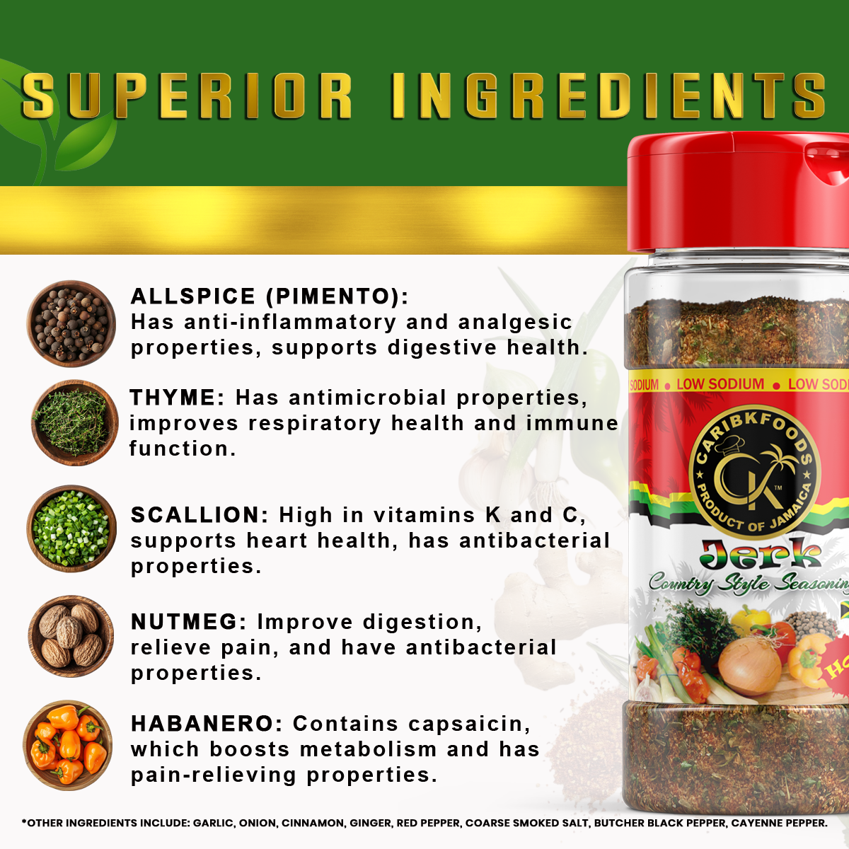 Jerk is a style of cooking native to Jamaica. The method of cooking is done over an open flame, in the oven, or on the grill. The meat is seasoned with either a dry-rubbed or wet marinated with a hot spice mixture called Jamaican jerk spice. Our Hot Jerk dry-rub has a robust kick of spices from scotch bonnet and other peppers. Our blend has 105mg of SODIUM, 0 Calories, and 0 Cholesterol.